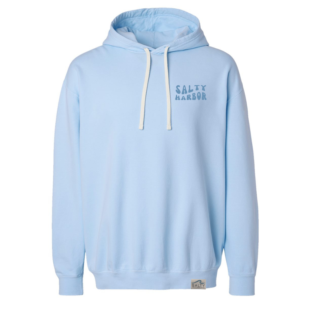 Indulge in the luxurious softness of the Wavy Tide Life Hoodie, garment -dyed for that lived in feel. Handprinted in eco-friendly ink in Kingston, MA.