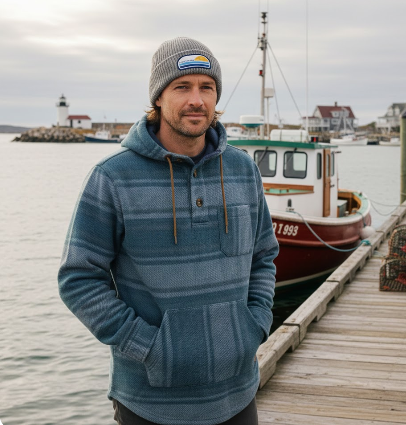 A must-have beanie, half recycled, half acrylic. The sustainability of the Shore meets the fine cuffed rib knit+ a strong personality that recall the vintage fisherman style.