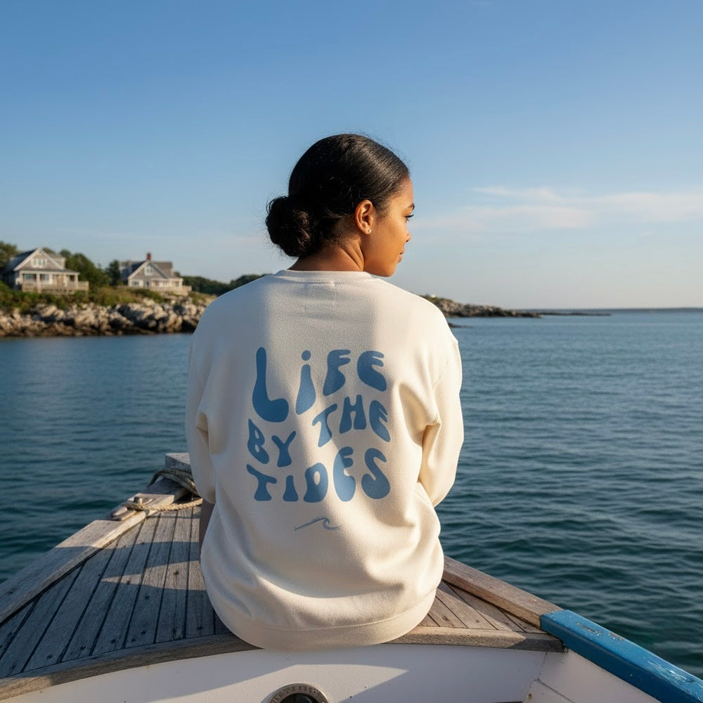 Indulge in the luxurious softness of the Wavy Tide Life Crewneck, Garment-dyed for that lived in feel Handprinted in eco-friendly ink in Kingston, MA.